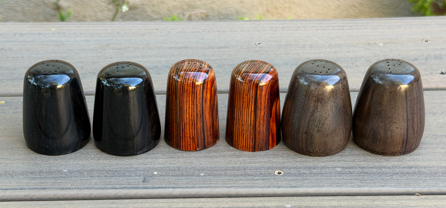 Here's a picture of three salt and pepper shakers that I made. The two on the left are ebony, the middle two are cocobolo and the two on the right are walnut (I think). I finished them with Target Coatings EMTECH EM-6000.