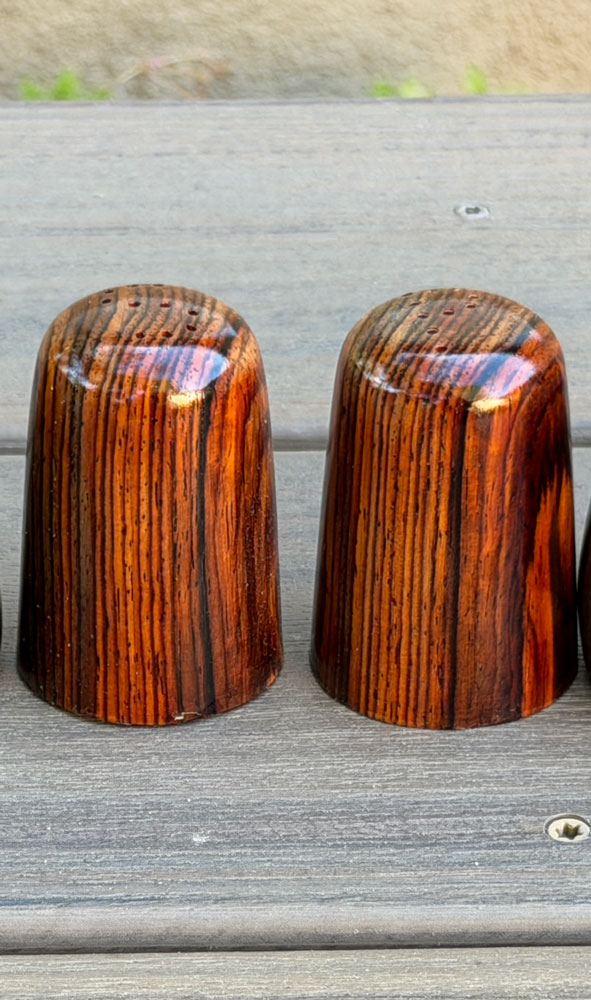 Beyond that, I used a 1 inch hole for the storage of the salt or pepper, and I shaped the shaker somewhat like a thimble. Here's how they came out.