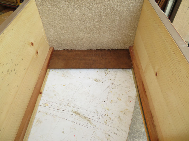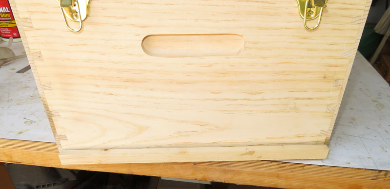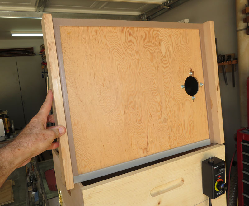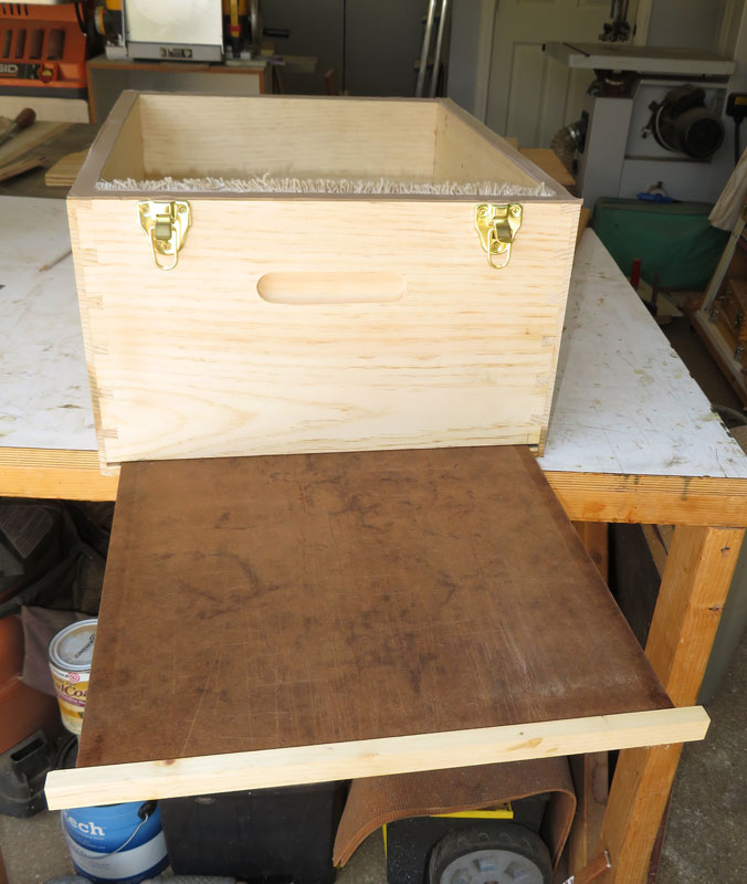 This box is the size of a standard brood box. I've added a slide bottom to the box. The slide is captured between two pieces of wood glued to the side of the box. You need to do it this way so that the bottom is not pulled upward by the low pressure in the box when you're vacuuming the bees. I also put weather stripping along the top of this box to form an air tight seal between the two boxes.