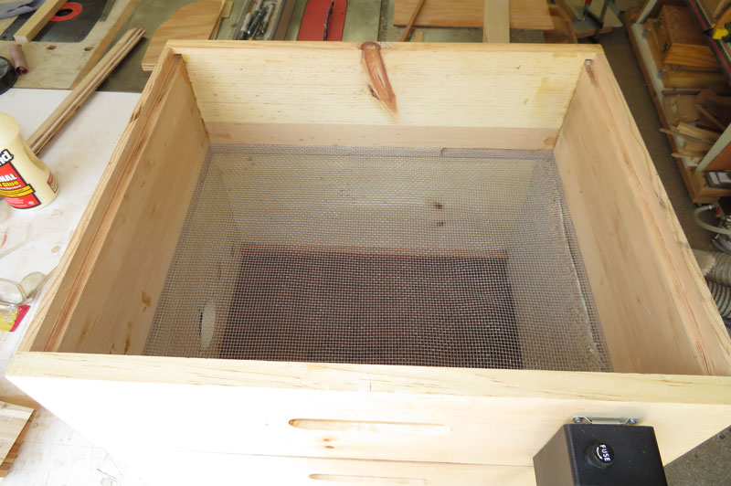 Since I wanted to get an air tight seal between the two boxes, I cut a rabbet into the inside of the box and stapled the hardware cloth to the bottom of the rabbet. Then I put wooden strips on top of the hardware cloth to fill in the rabbets. This gave the diffuser box a smooth bottom for a good air seal.