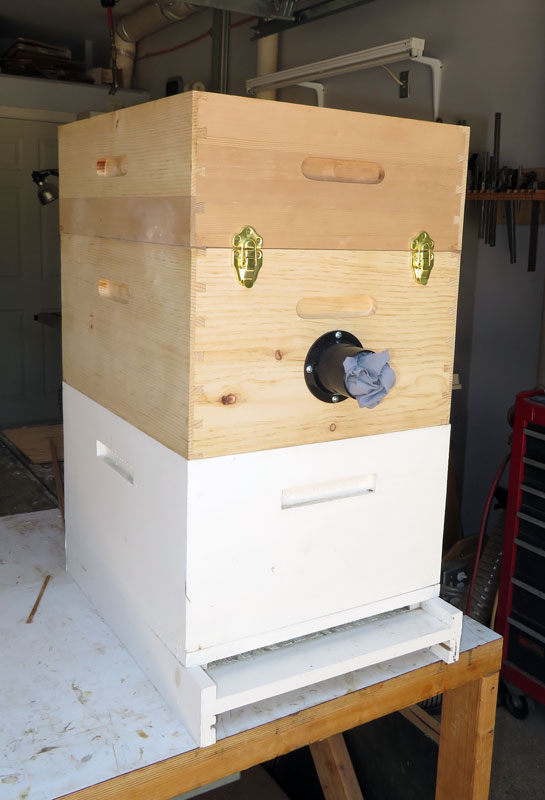 I show a rag stuffed into the intake port. I may try to develop some other method of blocking that port to keep the bees in the box. Maybe a small slider between the port and the box or a plug that fits into the port.
