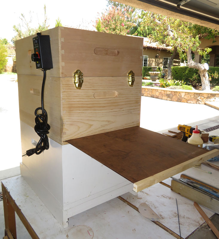 Here's a view from the rear showing the sliding panel pulled out. The bees should migrate into the regular hive box and you can remove the bee vacuum boxes in a couple of days.