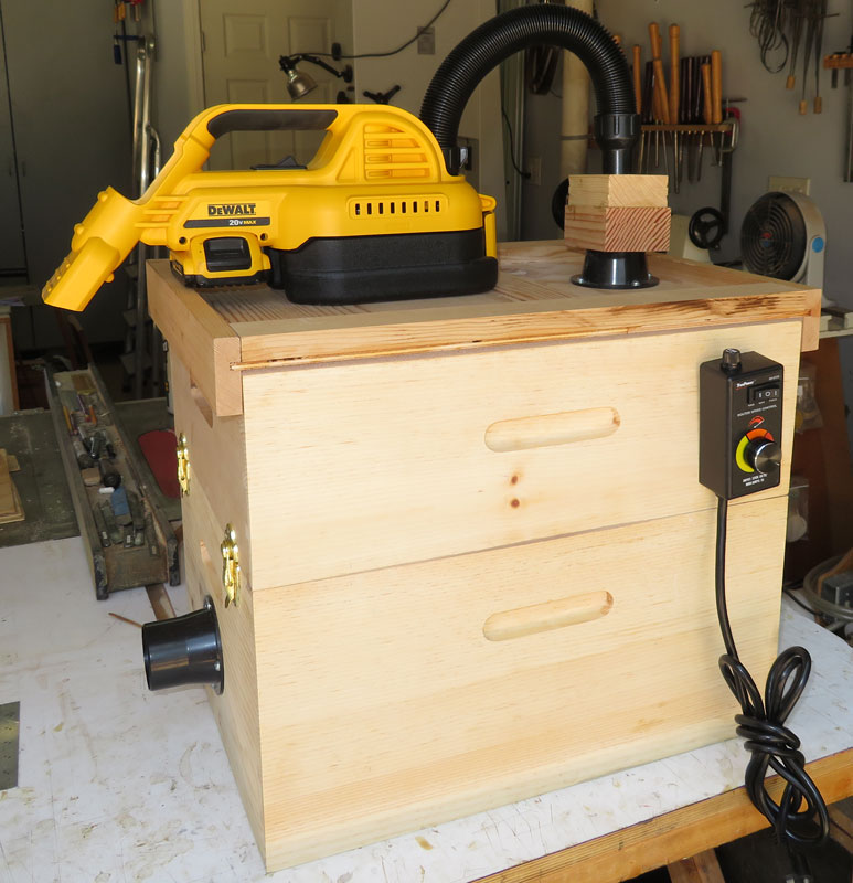Note, also, the router speed control device on the side of the box. The shop vac is plugged into this and this allows you to control the speed of the vacuum motor, and thus the speed of the air being pulled into the chamber. You need to adjust it so that it's at the lowest speed that will still suck up the bees. Too high a speed and the bees will be killed.