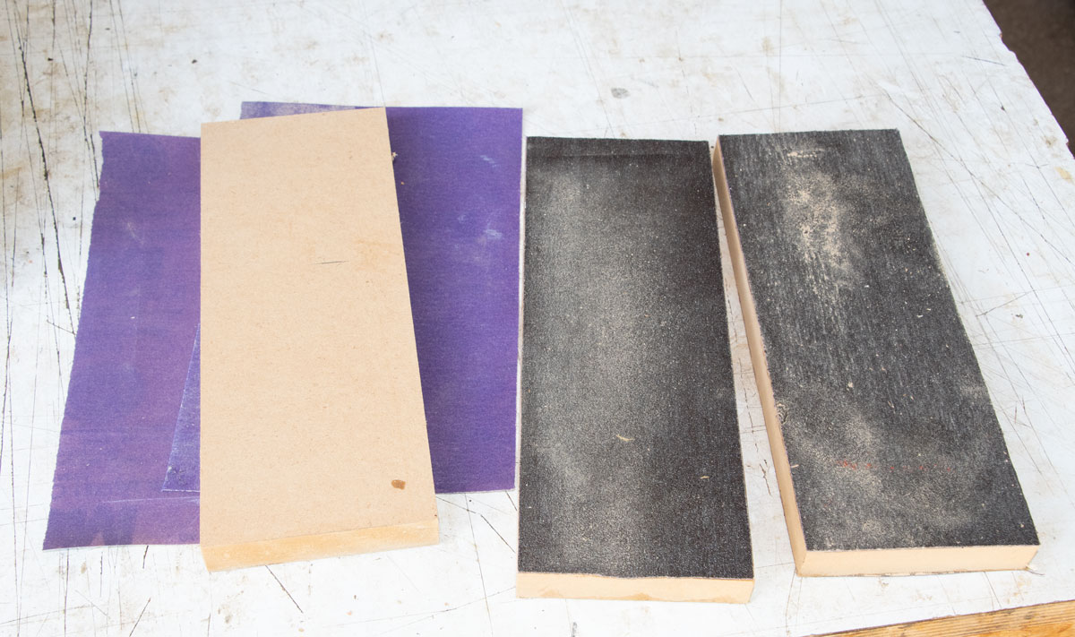 Then I have one sanding block with no sandpaper glued to it. I wrap finer sandpaper around the block and continue sanding, to remove the marks from the coarse sandpaper.
