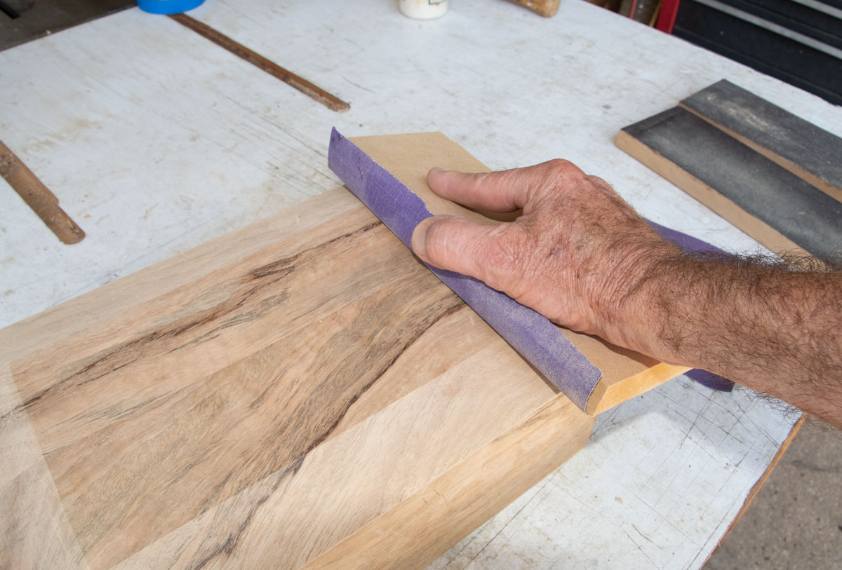 The four bevels we cut into the top have saw marks from the cuts. The bevels need to be sanded to be as smooth as the rest of the top. You have to be careful sanding them because you want the lines to be straight and crisp. If you just take a piece of loose sandpaper and try to sand them, you'll soften all the edges and your top won't look very nice.