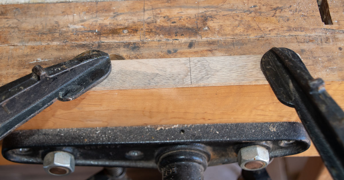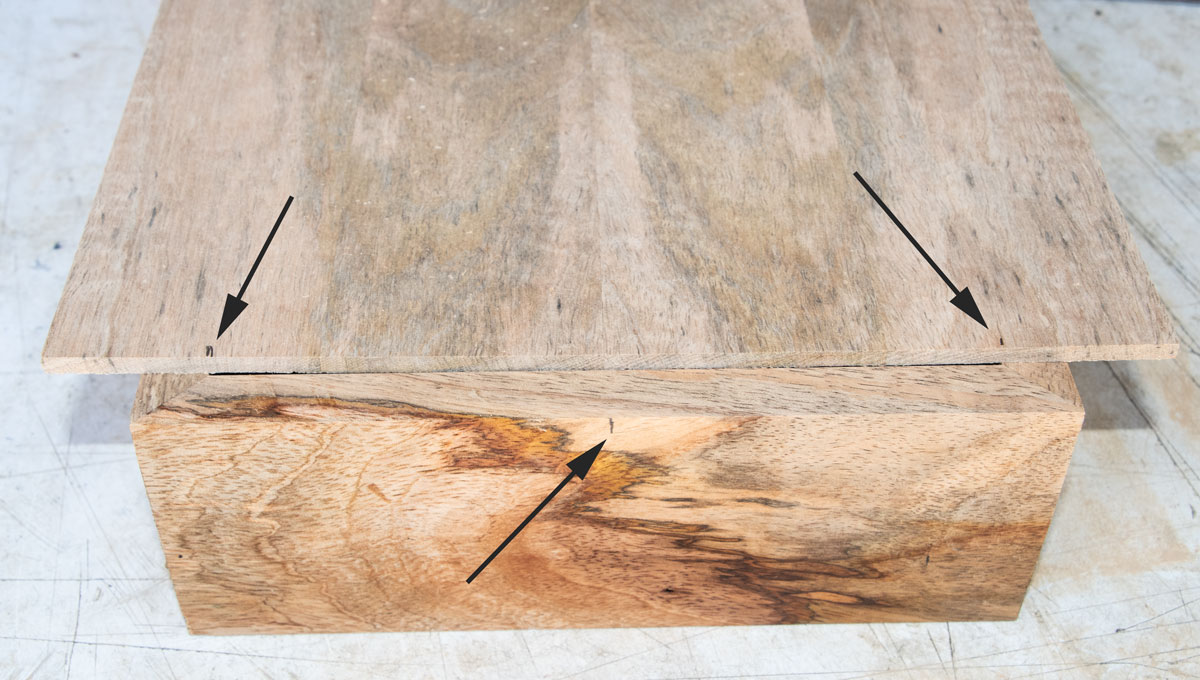 Now, I want to cut the panel to width. I glued up pieces to make the panel and I want one of the seams in the middle. So I mark the center of one side, line up the seam with that mark and then mark the width. My marks are shown at the arrows.