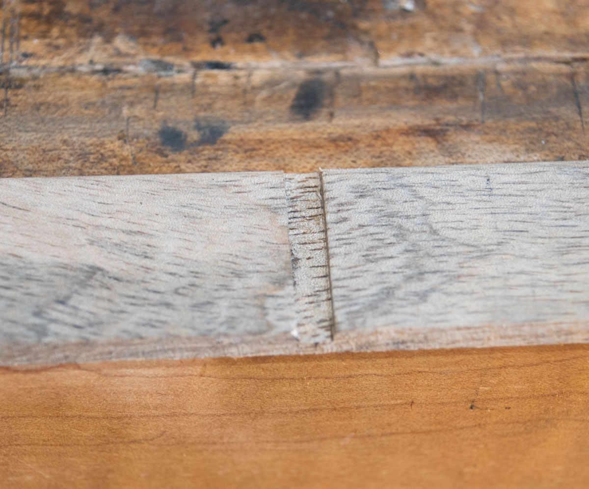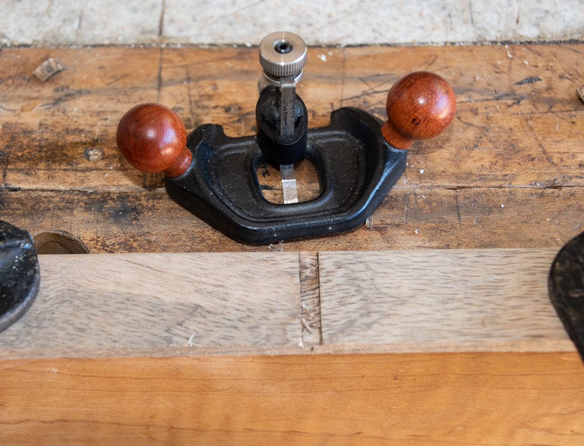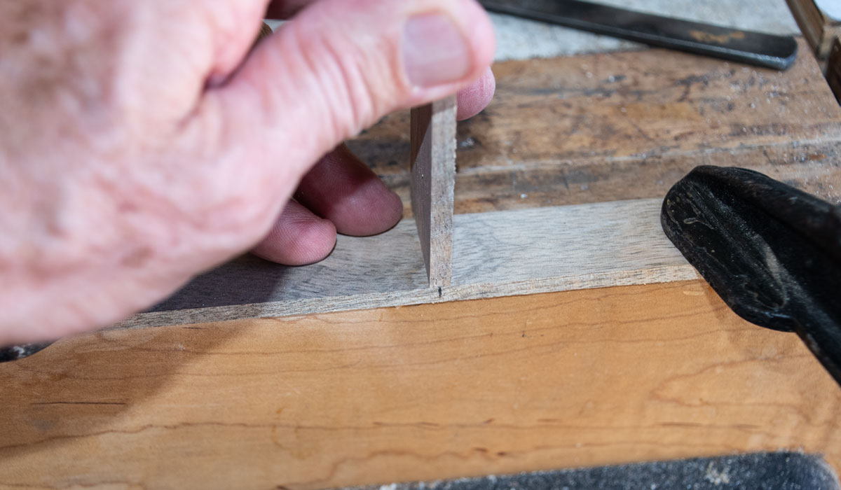 Here's the center piece of wood in the dado. If you make the dado too narrow, don't try to widen it - sand the end of the center piece to fit the dado. Usually you're only off a small amount so go slow with the sanding or you'll then have a loose fit.