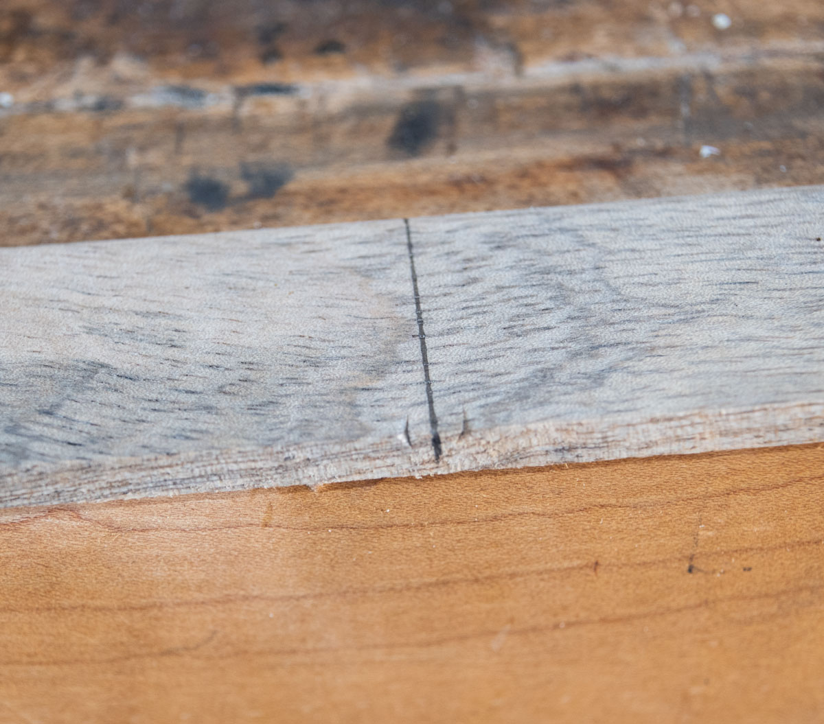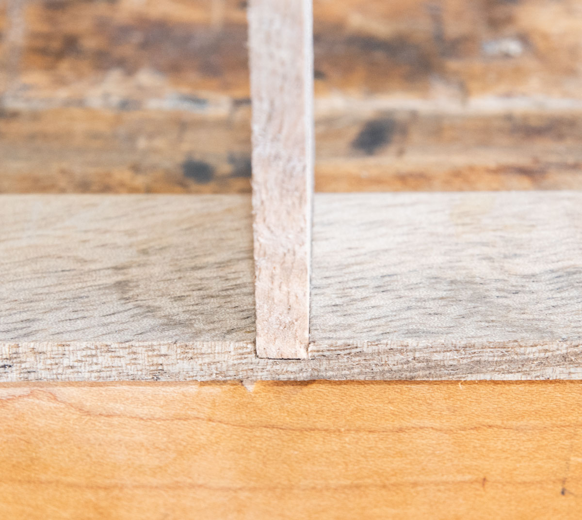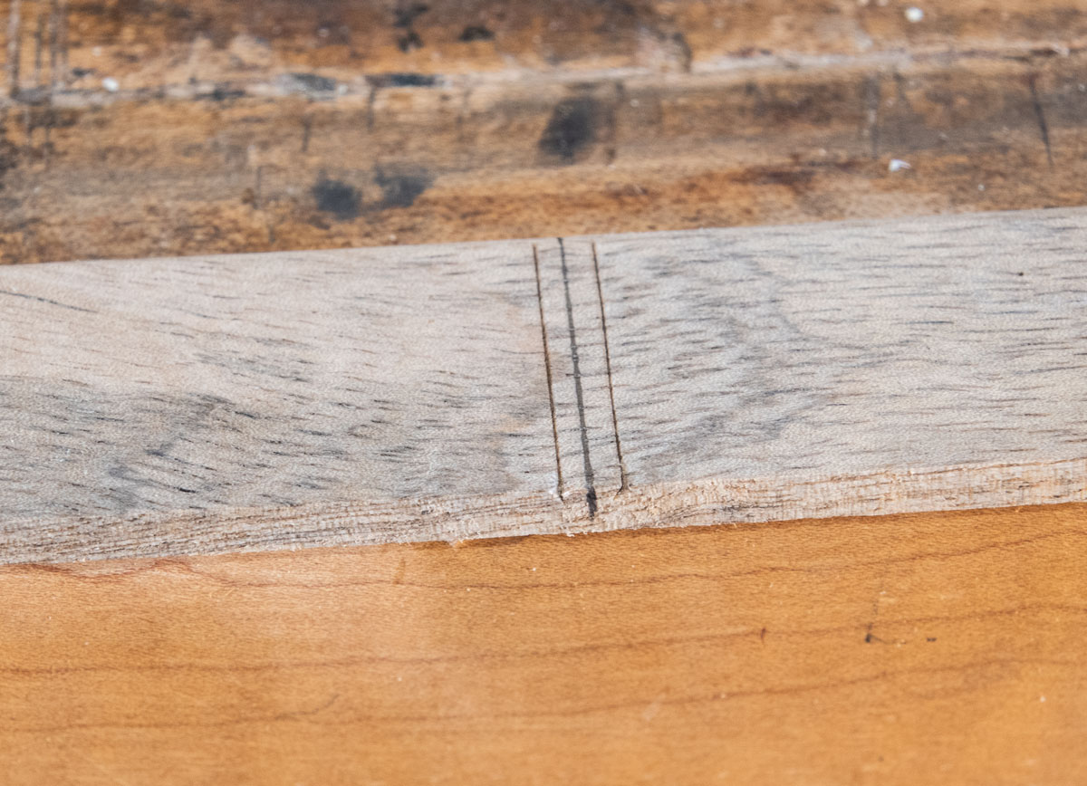 Then I stand the piece that will be the center on the center line and make a mark on each side - a very close mark. It's easier to fix a too narrow dado than a too wide one.