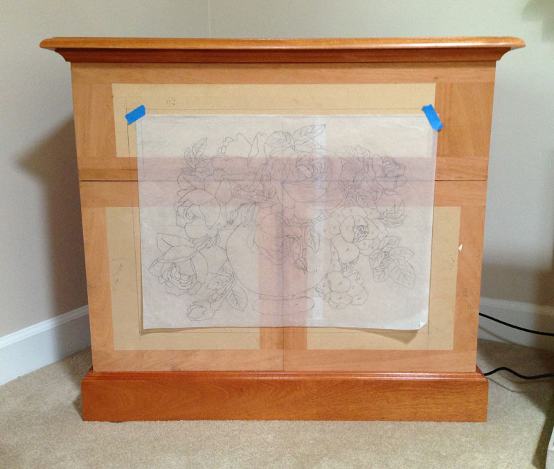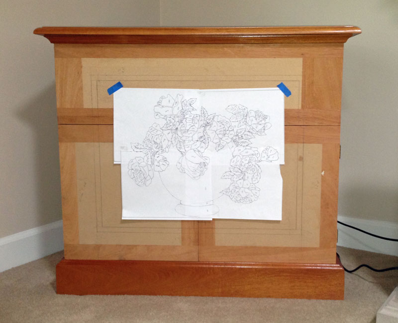 8/13/2013 I'm making progress on the marquetry design. I'm not finished yet, but I have enough to be able to lay out the front of the cabinet.