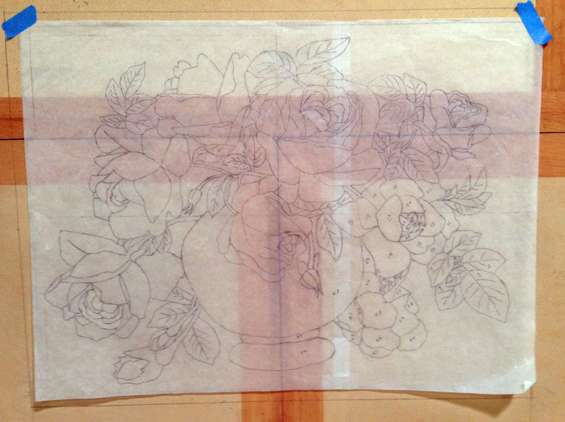 8/26/2013 The first design did not make it past the client (my wife). She had a number of suggestions which led me to do another drawing. It's similar to the first one, but different. We did decide that the roses will all be white, and she wants the vase to not be a strong color, so I'm going to make it in an earth tone. Here's what the design looks like now.