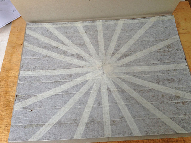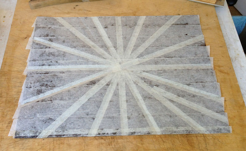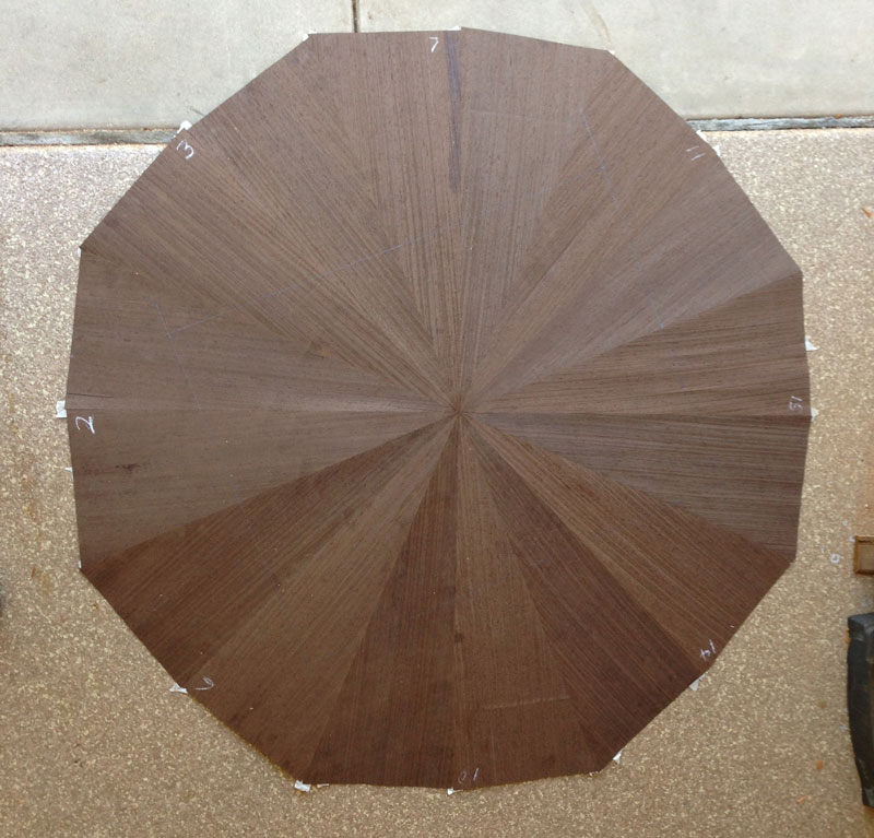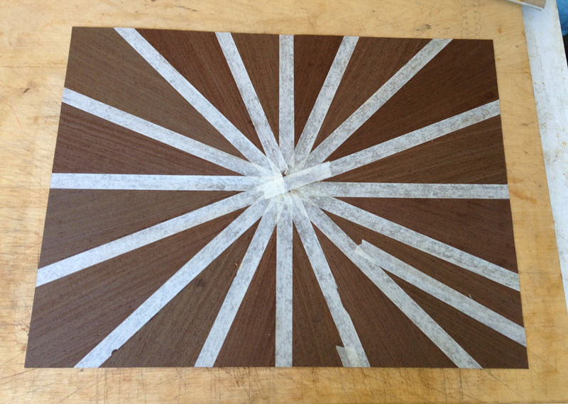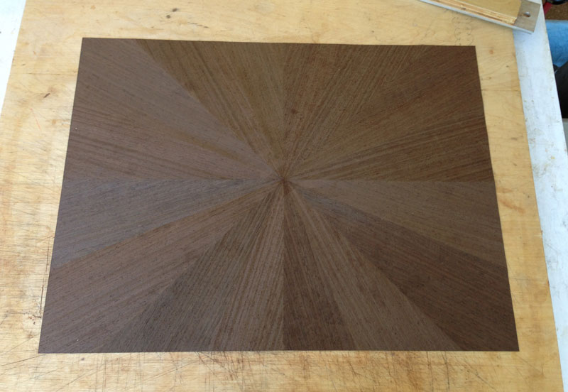 I also put the background together - 16 pieces of wenge laid in a radial match. A lot of the wenge will be cut away by the design but I wanted the pieces left to be pointing to the center. I thought that looked better than just laying it vertically or horizontally. Here's the radial match before trimming.