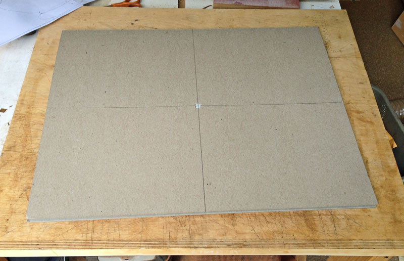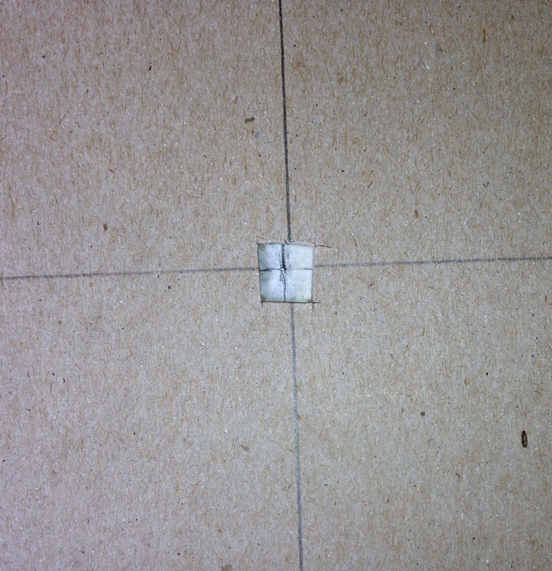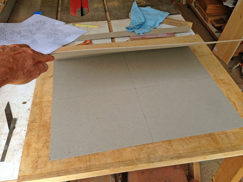 I've drawn a horizontal and vertical line on both the top and inside bottom. I've also cut a small window in the center of the top. This helps me align the background veneer. I replace the cut out cardboard after getting everything aligned.