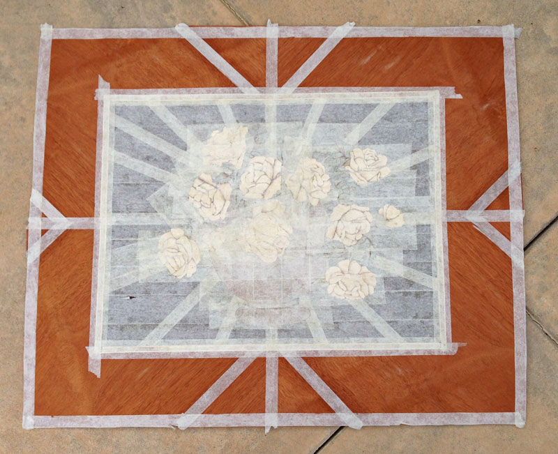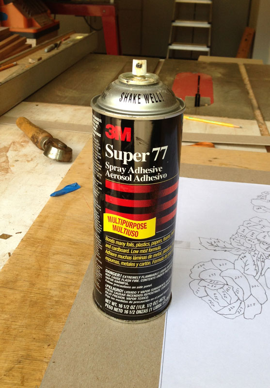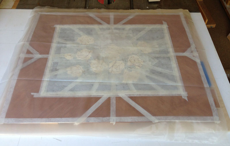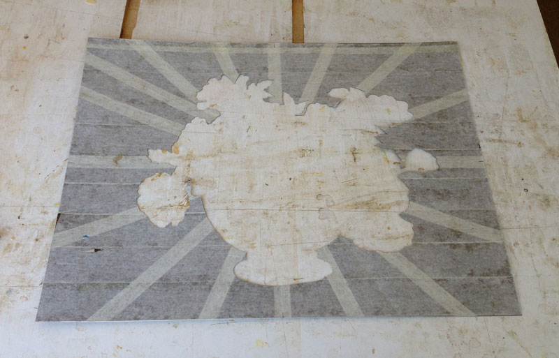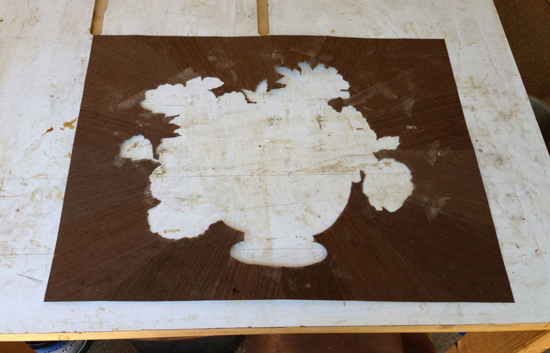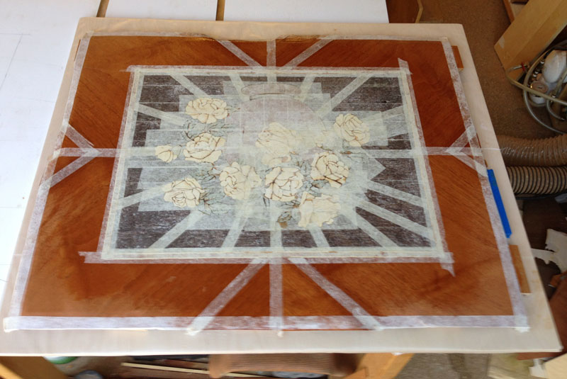 9/14/2013 Yesterday, I did the glue up. I don't have any pictures of the process because the glue up is a stressful procedure and I didn't take any time out to take pictures. I mix up the urea formaldehyde glue (it comes as a powder) and spread it on the substrate. I also put a bit on the back of the marquetry to make sure that the glue came up between the elements - so that there wouldn't be any voids between the pieces.