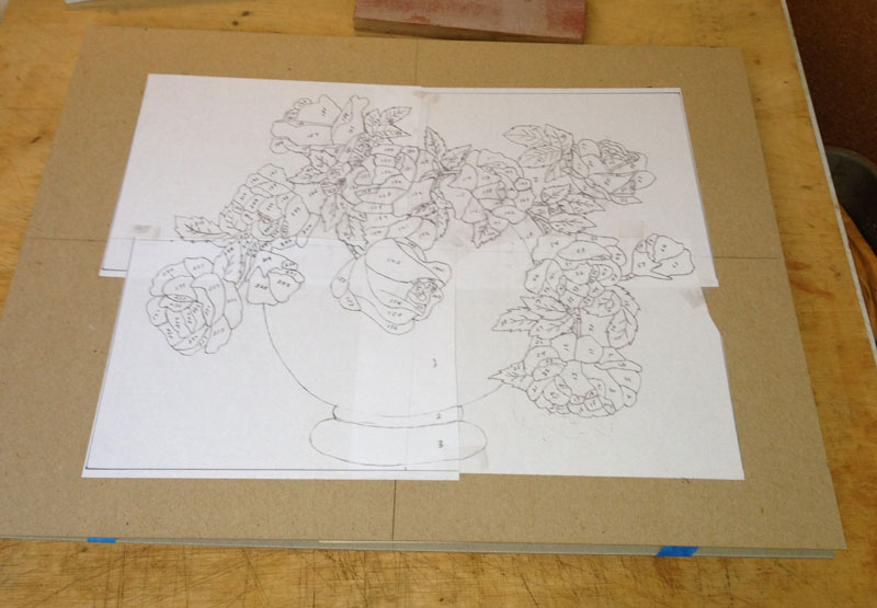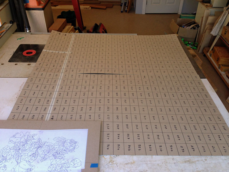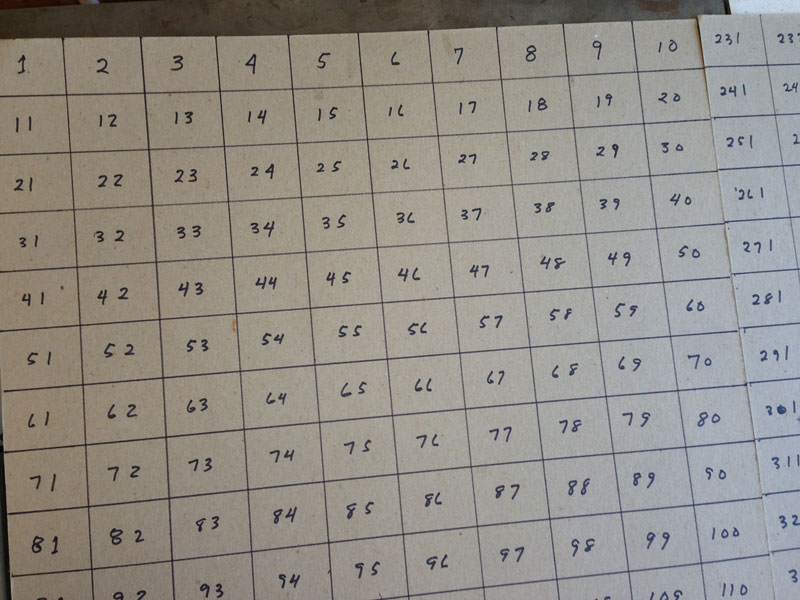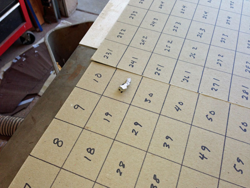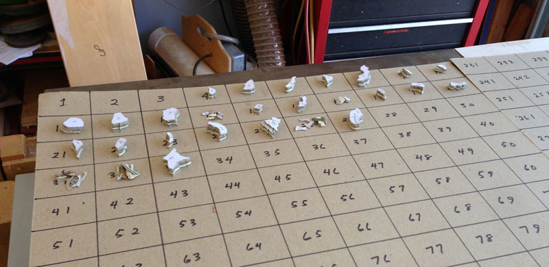 As I cut out the elements, I need to place them so that I can easily find each one. I do this by using a numbered grid, as seen in the following two pictures.