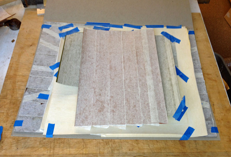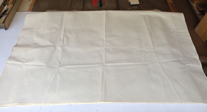 Then I place a layer of heavy cloth, such as sail cloth. The reason for this is to spread the pressure across the veneer. If there are pieces of veneer that are thicker than others, the cloth will press the lower pieces as well as the higher pieces.