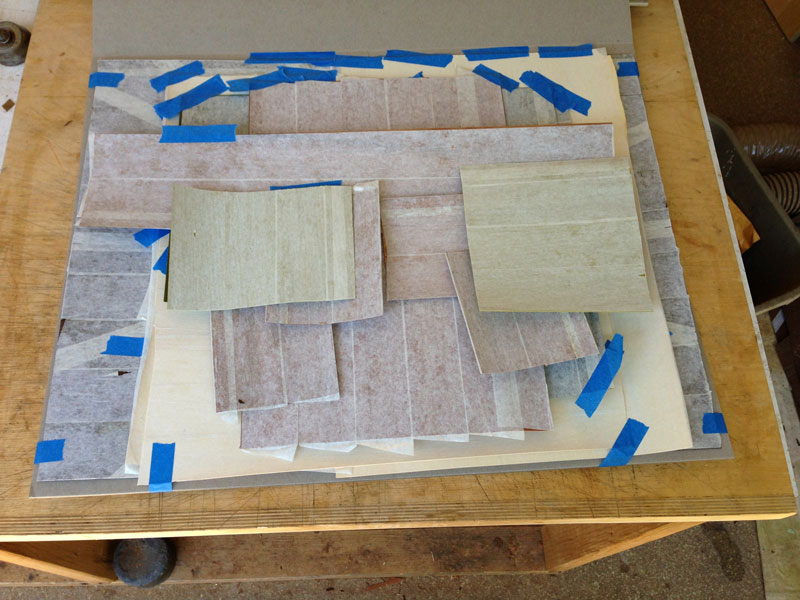 8/28/2013 A fair amount of preparation goes into making a packet. Each piece of veneer has to be covered with paper. I use 2" veneer tape. When one side is covered with tape, the veneer tends to curl which makes placing it a bit more difficult. Some veneer, such as the holly and the green, are laid both horizontally and vertically so that I can choose the piece that give the grain direction along the long axis of the element (a leaf, for example).