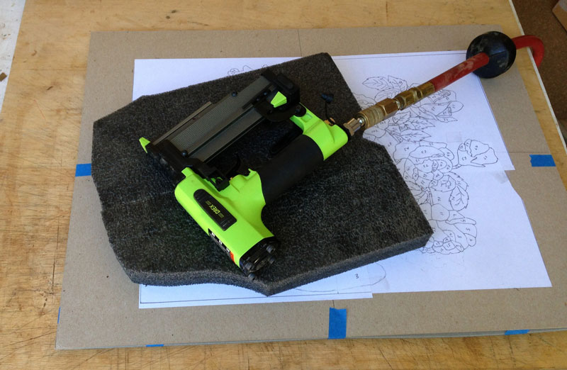 The next step is to put pins through the packet so that the veneer does not shift while I'm cutting it. Our ancestors used very small nails, but we can use 23 gauge pins. You want pins that are longer than the thickness of the packet so that you can clinch the pins over. Since I want the pins to extend out the back, I use some foam behind the packet when I shoot the pins.