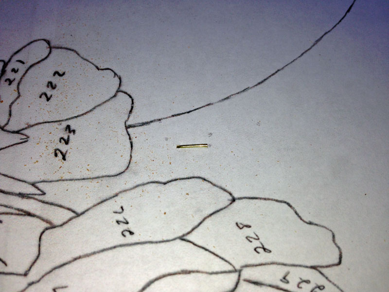 After I clinch the pins on the back, I put blue tape over the pins so that they won't get hung up while I'm moving the packet around on the scroll saw.