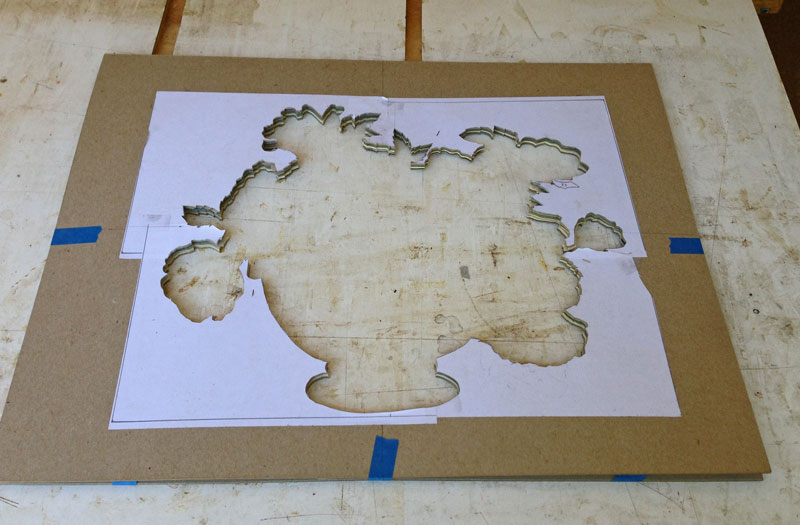 I position the cartoon where I want it to be and tape it in place. Then I draw a couple of marks on the cardboard at the top of the cartoon and on each side, at the top. These will be used to align the cartoon when I glue it down.