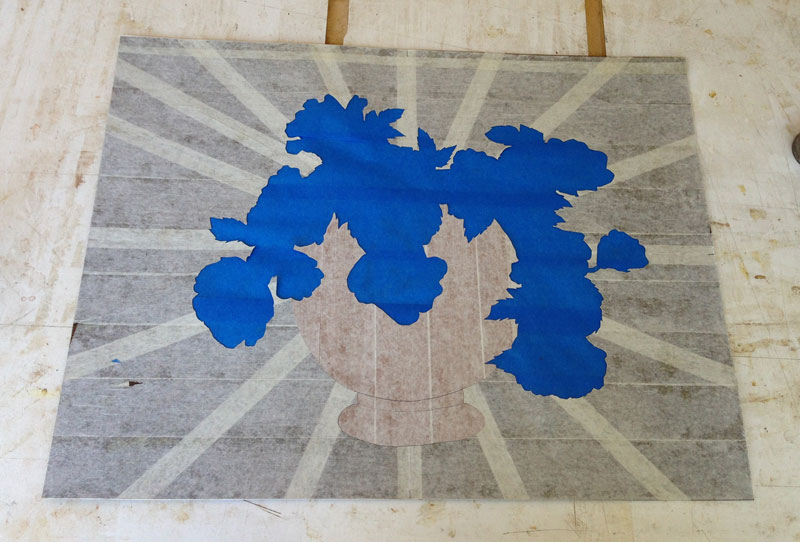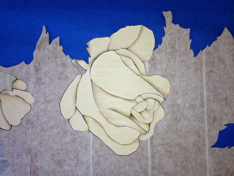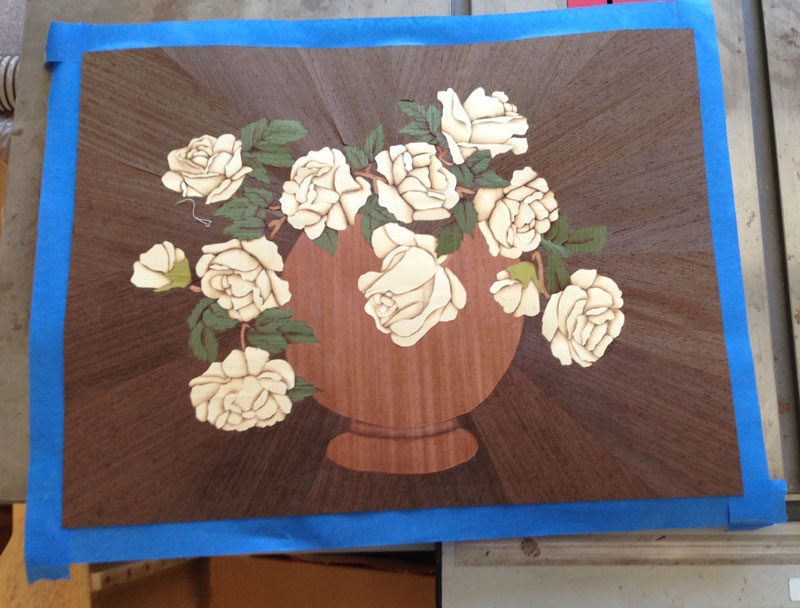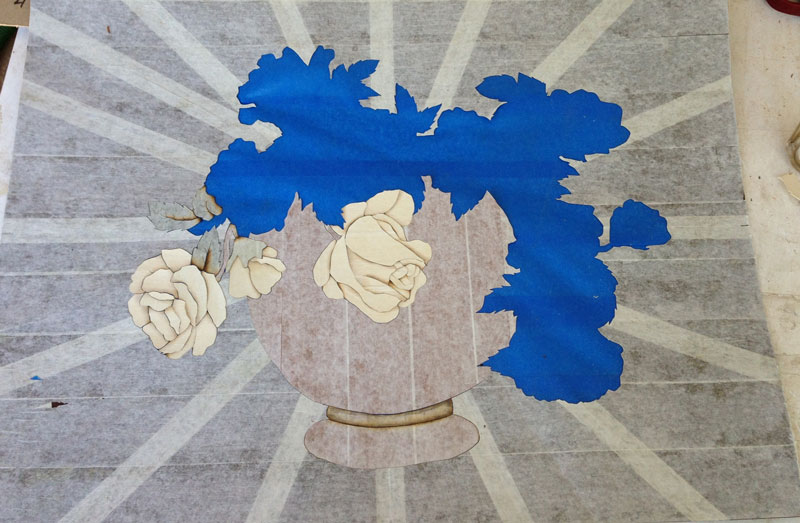 The blue tape will hold the elements as I start to assemble the marquetry. This next picture shows the background with the vase parts put in. I'll do some sand shading on these pieces but just wanted to show how things fit together.