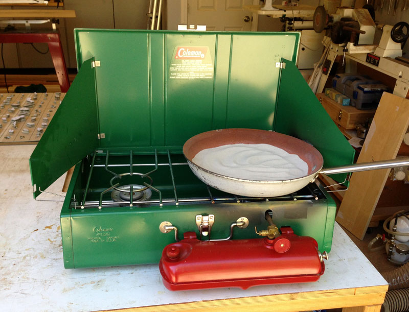 9/4/2013 Next is the sand shading. Here's my setup for sand shading - a Coleman gas stove and an old frying pan with about an inch of sand in it.