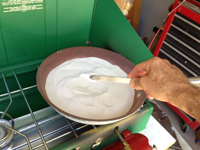 It takes a while to get the sand hot, maybe 15 minutes. I test the temperature by putting a scrap piece of veneer into the sand to see if it will shade, and how fast.