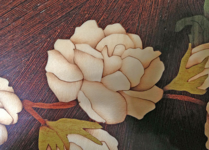 Here's a close up of a rose from my floral coffee table. You can see the elements are outlined by the brown glue. to my mind, that just helps delineate the pieces and makes the design stand out better.