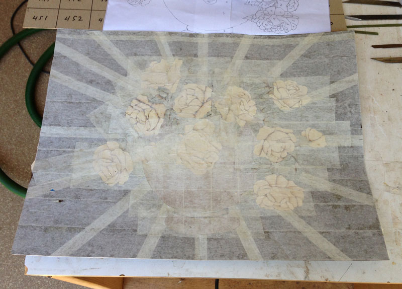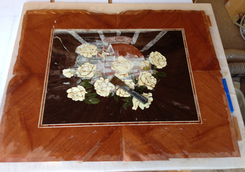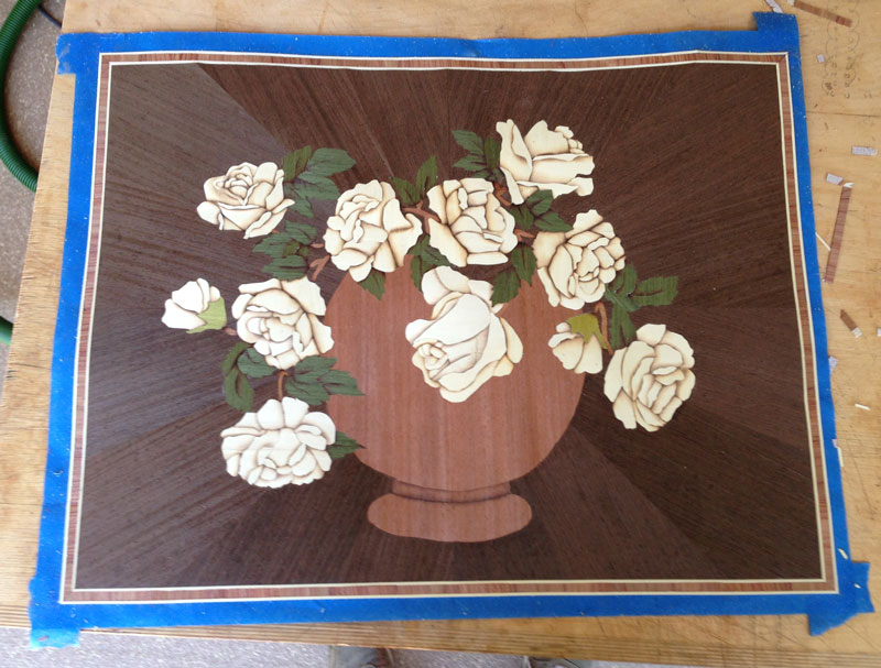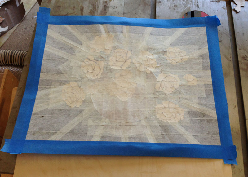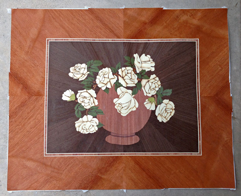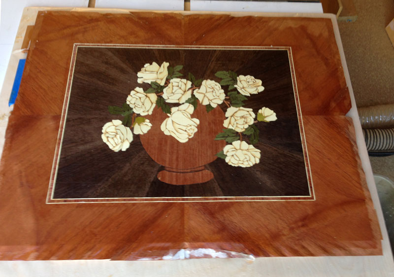 Here's the work in progress. You're looking at the veneer from the show face and it's all covered with paper tape - so the final colors don't really show up. If you work with the paper tape down, you can see the colors as you work, but then the picture will come out as a mirror image.