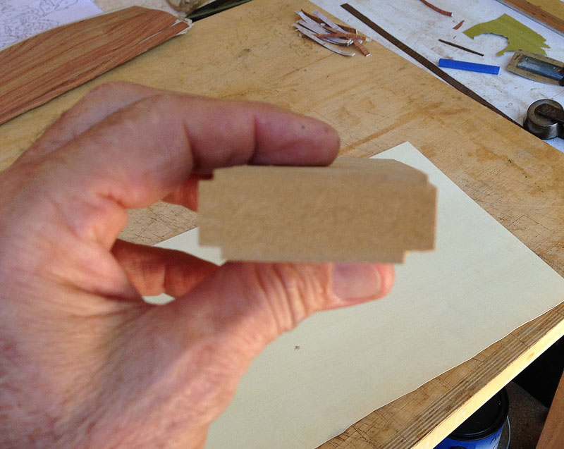 Now, I can place the background veneer exactly where I want it and then replace the cut out piece of cardboard, using a tiny amount of glue to hold it in place.