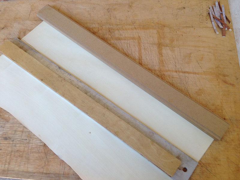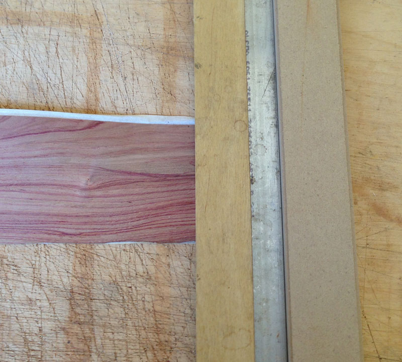To cut it, I do exactly the same as for the holly, except I use the 4/16" (1/4") rabbet. Cut the end square and slide the guide against the veneer.