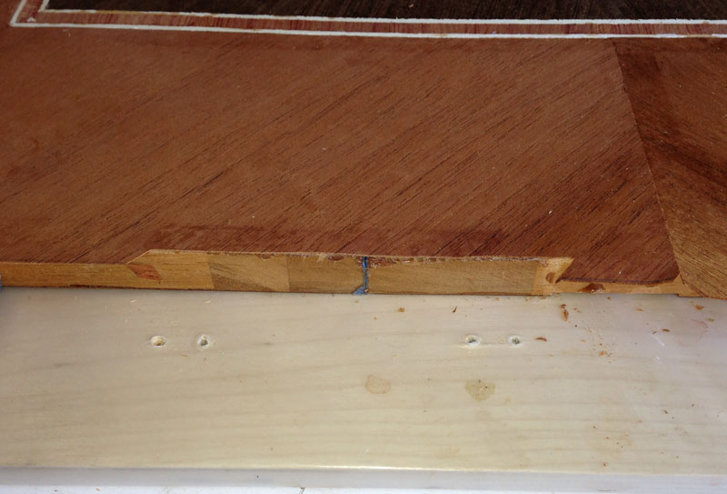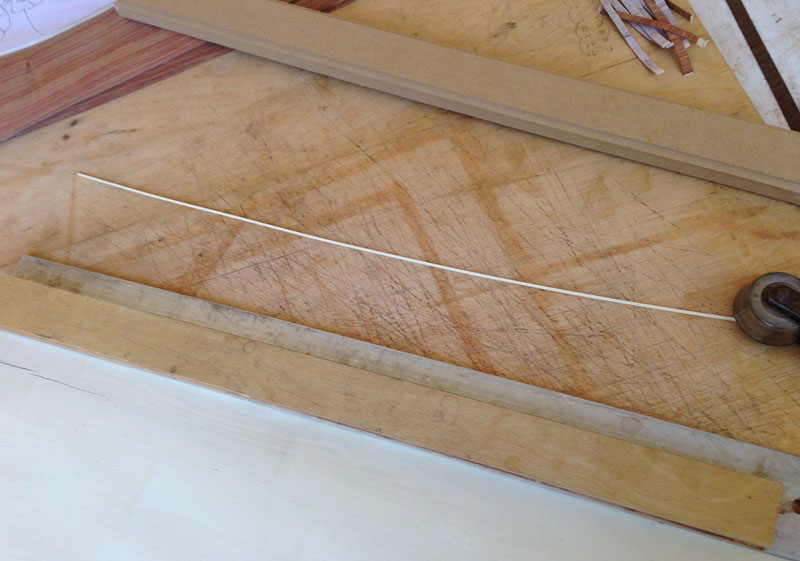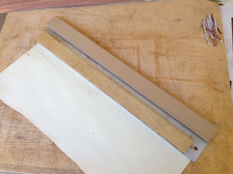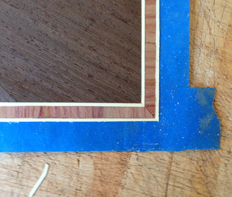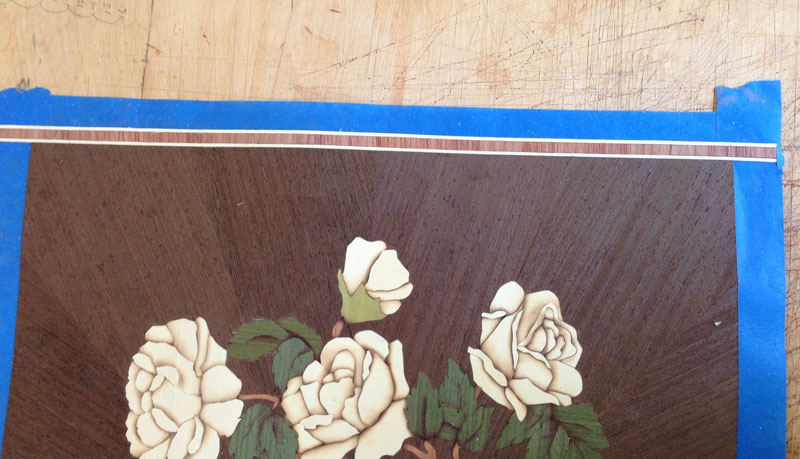 9/8/2013 I trimmed the veneer to size - it required taking about 1/2" off on all sides. Next, I'm going to lay the banding. I'm going to use quarter cut tulipwood, cut across the grain, outlined by two strips of holly.