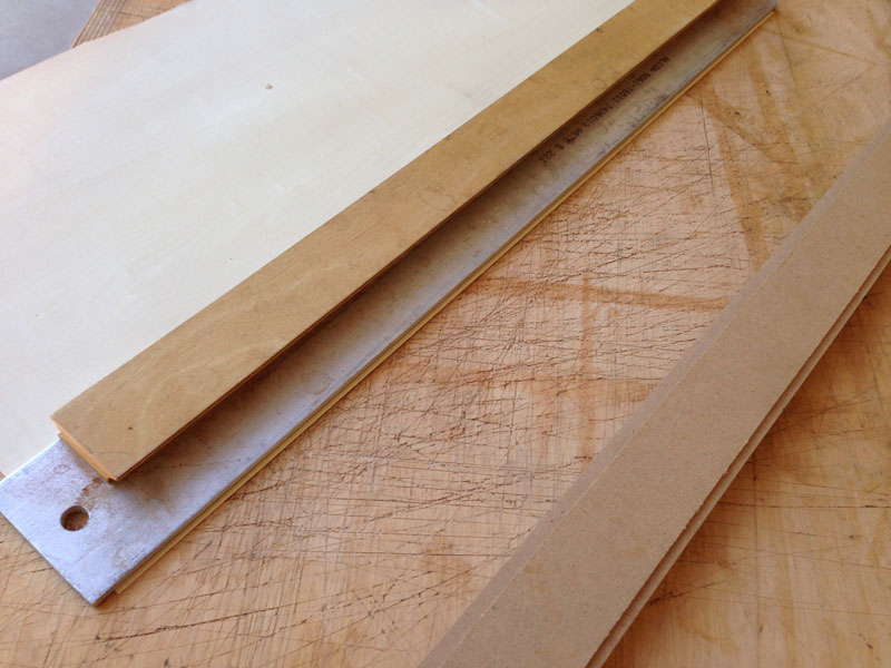 Then I remove the guide. This leaves a 1/16" strip of veneer exposed beyond the straightedge.