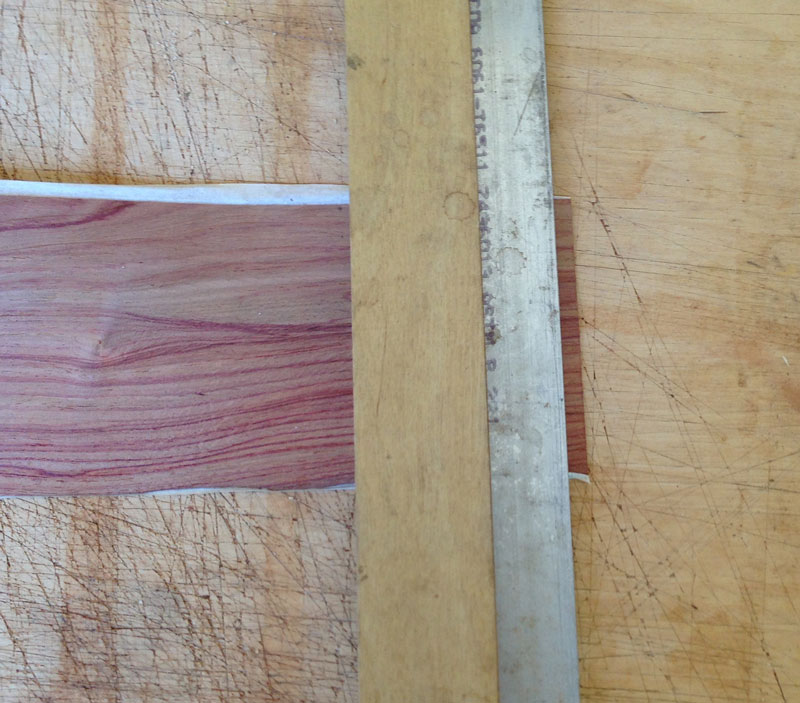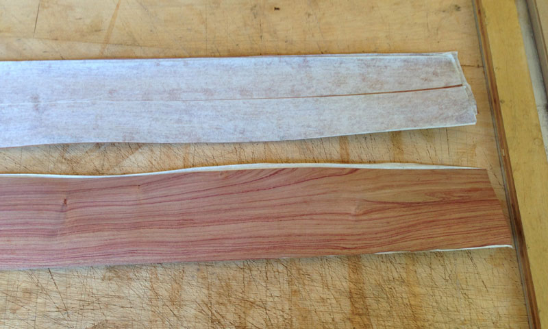 The tulip wood is cut across grain. When you do this, you must provide something to hold the veneer together. Otherwise, it'll fall apart in the cutting or when you attempt to handle it after cutting. Here, I've used paper tape on one side of the veneer. For small amounts of banding, you can use blue tape instead of the paper tape.