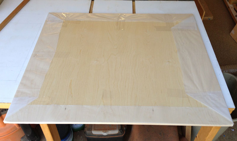 Then, I covered the plywood with plastic. The reason for doing that is to make sure any glue that squeezes out does not glue a door to the plywood.