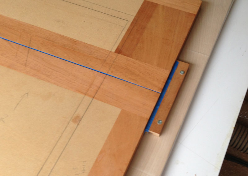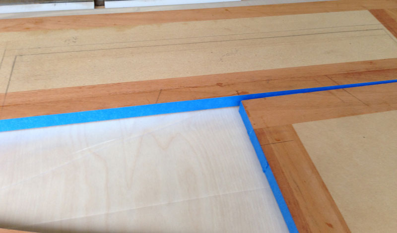 9/11/2013 I worked on preparing for the glue up. Since there are three doors that make up this glue-up, I need to construct something that will hold the doors in place during the press. I start by cutting a piece of plywood larger than the three doors.