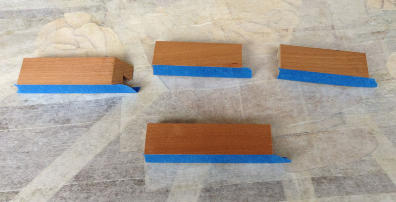 One problem with this glue up is that the seam in the veneer MUST align with the space between the doors. To make sure I achieve this alignment, Paul Schurch suggested that I glue blocks onto the veneer to exactly position the veneer on the doors. Here's a few of the blocks. Note the blue tape on them to keep them from getting glued to the doors.