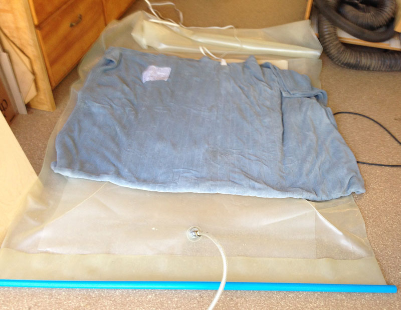 Here's a picture of the bundle in the vacuum bag with an electric blanket on top. The UF glue is very sensitive to temperature and won't cure at temperatures much below 70 degrees. While it's hotter than that now, extra heat causes the glue to set faster.