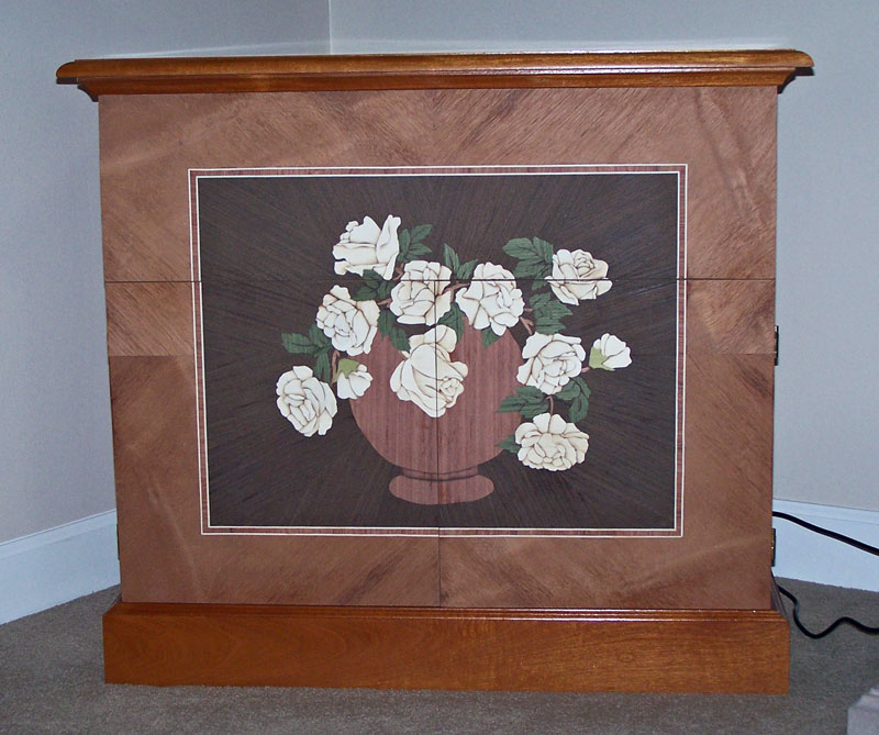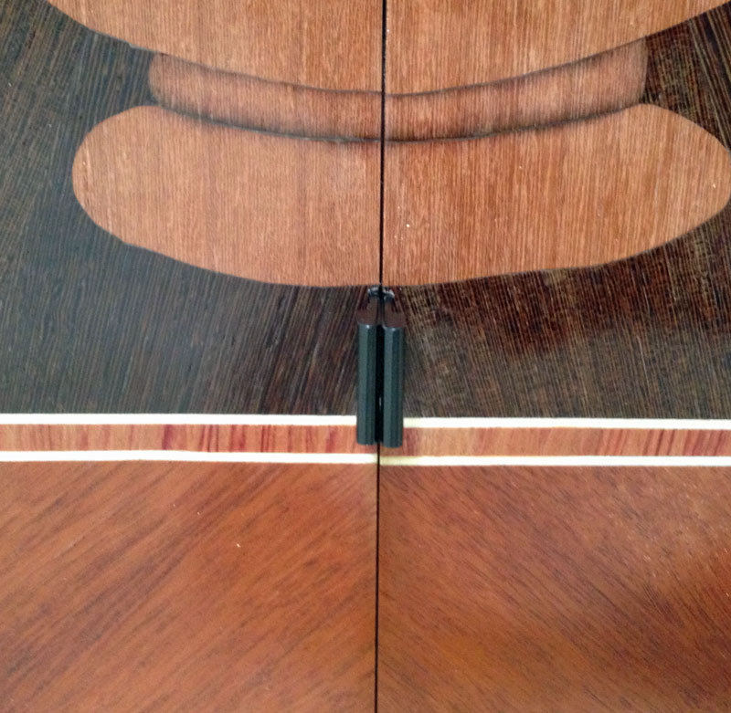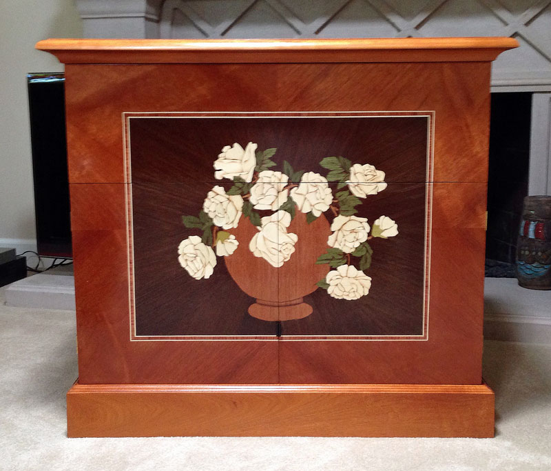 9/20/2013 Here's a picture of the doors finished and fitted. My issue now is knobs. I'm thinking of putting an ebony handle on the top door but I'm stuck on what to do for the bottom doors. I don't want to put knobs on the marquetry but putting them at the bottom would be awkward to reach.