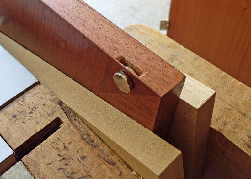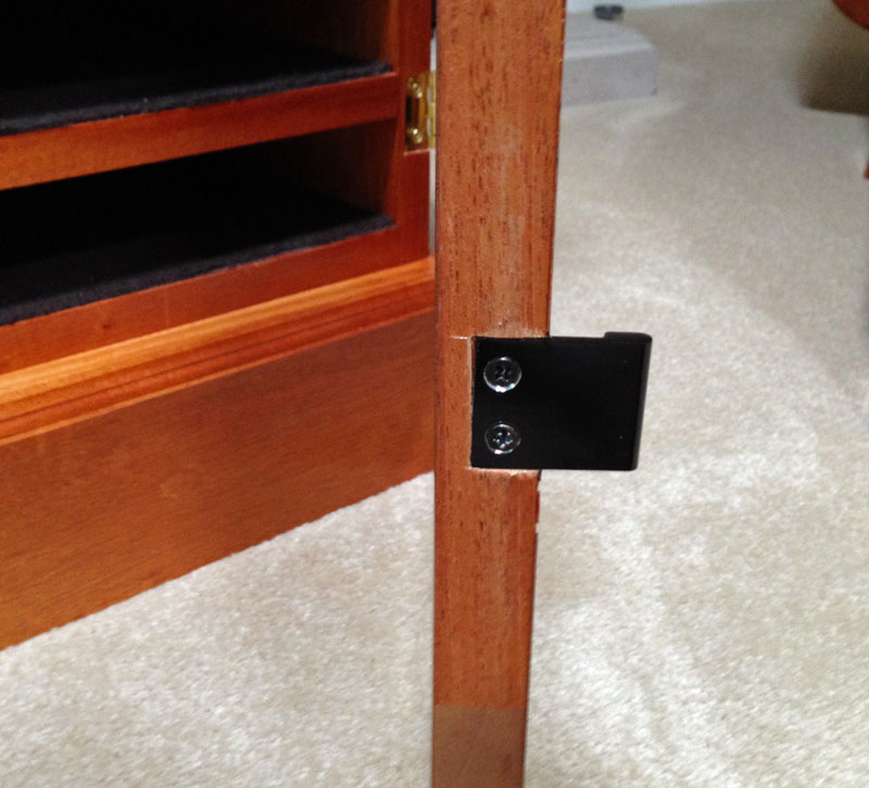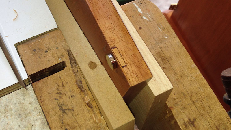 9/22/2013 I put in the magnets to hold the lower doors closed. I wanted to do it invisibly so my only choice was to cut a mortise for each magnet from below. The problem is that the magnet must be very close to the surface or there won't be enough pull to hold the doors closed. So the mortise must be cut with one very thin side.