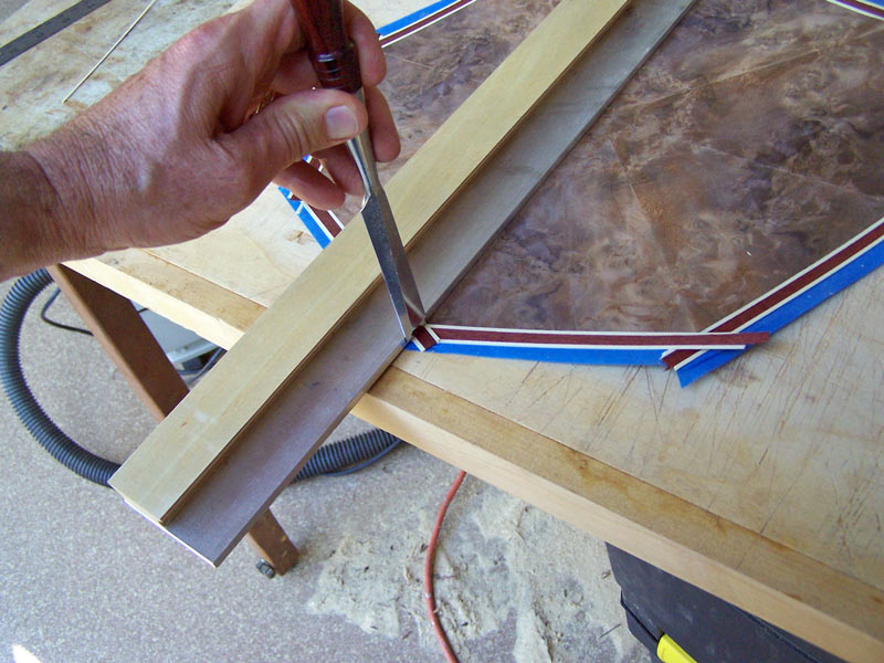 Then take a good sharp chisel and place it against the straight edge and over the banding. Do not let the chisel overlap the walnut burl.