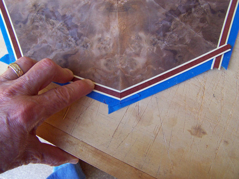 Then turn the whole package upside down. You'll use the blue tape to hold the banding while you lay it. Start with the holly. I use my fingernail to pull the holly against the walnut burl while I push it down on the tape.