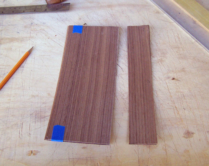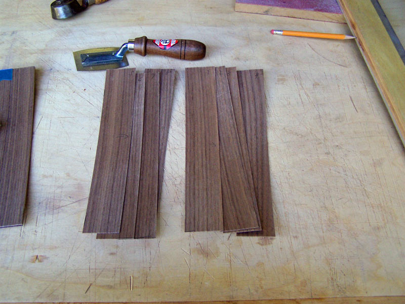 I then sanded the edge on the remaining veneer and cut another set of strips a bit larger than 1 1/2" - but exactly the same size as the first pieces.