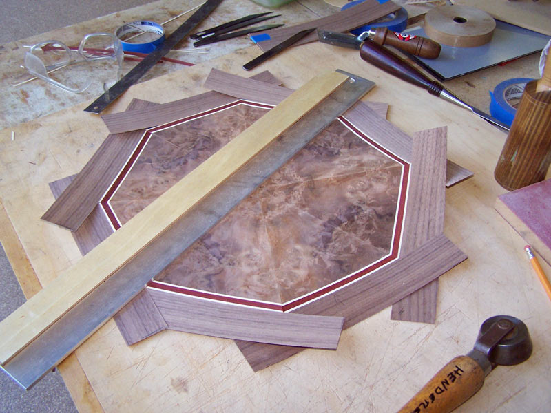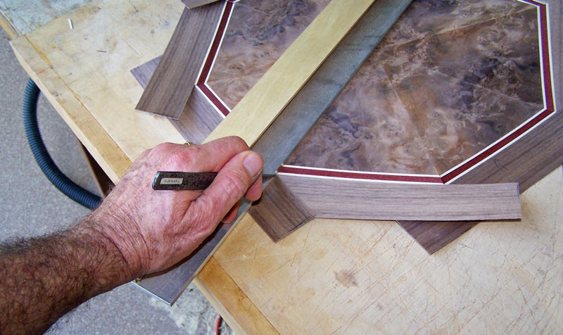 I want to miter these pieces just like the banding - exactly along the line of the seams in the walnut burl. Like before, I lay my straight edge on a seam of the burl.