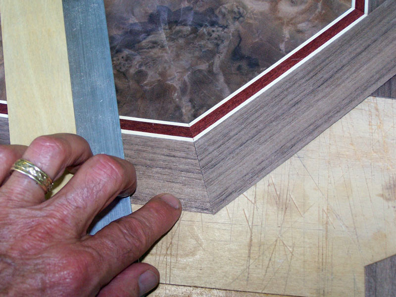 Lay in the walnut border against the banding. Note how I overlapped the border. If you're right handed, this overlap works best because when you cut, the top piece falls away and is not trapped under the straight edge. If you're left handed, reverse the overlap.