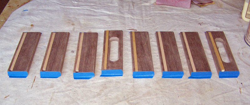 Once the sides are well sanded, to P220 grit, put tape on the miter joints. I also usually put a piece of MDF in the grooves to keep the lacquer out.