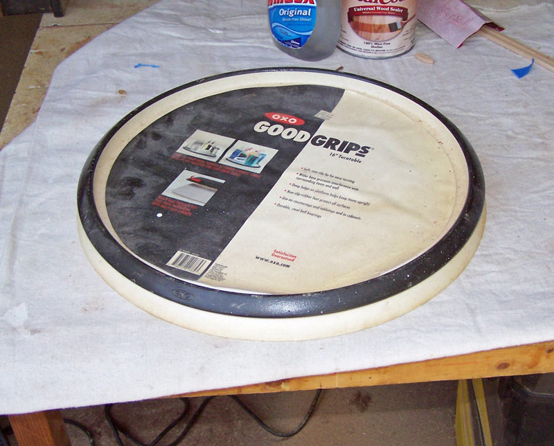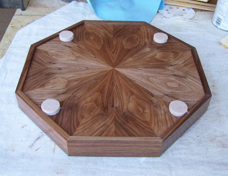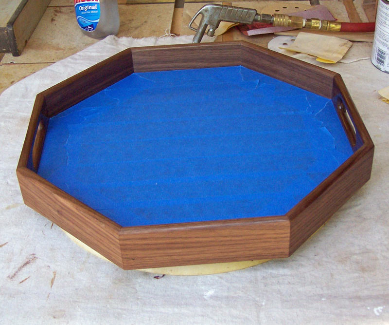 Here's the tray sitting on the lazy Susan ready for the lacquer. Note how the grain flows around the tray sides, both inside and outside.