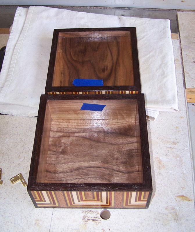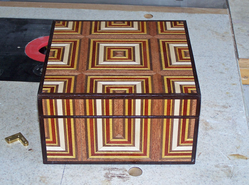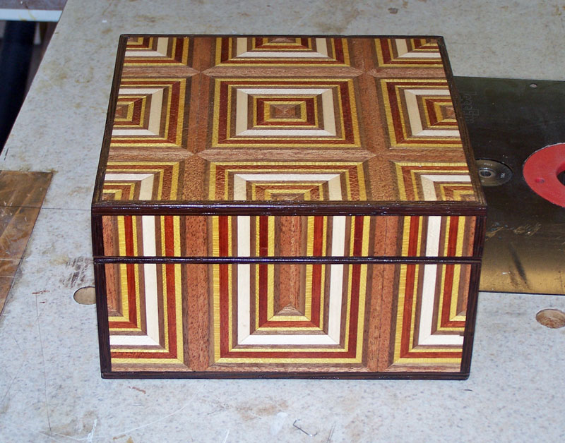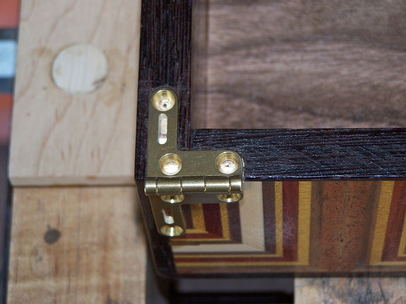 What I discovered was that his box was a veneered box and the decorative edging was wenge. The difficulty with his veneer pattern is that if the hinges are not put on exactly right, the veneer will not line up and it'll be obvious that something's wrong. The problem with the wenge trim is that I'll have to cut through the wenge to install the hinges. Wenge is a hard wood that splits fairly easily. Not the easiest wood to work with. So installing the hinges is going to be a challenge, even more than usual when installing quadrant hinges.