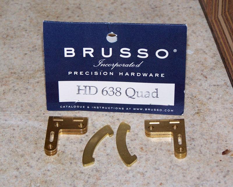 Brusso makes very high quality hinges, and charges a high price. These hinges run about $40-$50 for the set of two. Note that the support arms can be removed from the wings. That's not true of all quadrant hinges and will affect the way you install the hinges. When the process is different if the support arm is not removable, I'll try to remember to note it in the text.