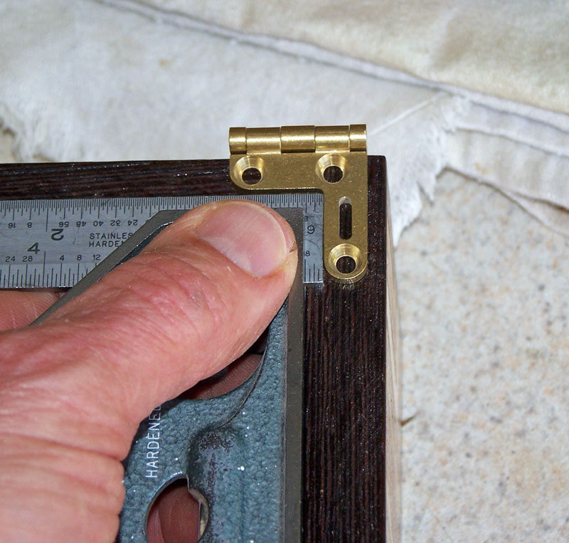 To center the wing, use a small combination square and adjust the scale so that you can place the square against the side of the box (inside and outside) and have the scale just touch the wing, without moving the wing. When you can do this, the wing is centered and you have a measurement that can be taken to the other wings to make sure they're exactly the same. Once you find this distance, make sure your combination square is locked down securely, and set the square aside. Make absolutely sure the scale does not move during the setting of the hinges (meaning don't drop the combination square:-).