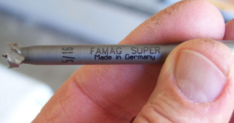 If you recall, I used my knife to mark the front of the wing and the sides. If I was very precise, the knife marks for the sides will be 5/16" apart. I can take the 5/16" Forstner and position it so that it just touches the three lines (front and two sides).